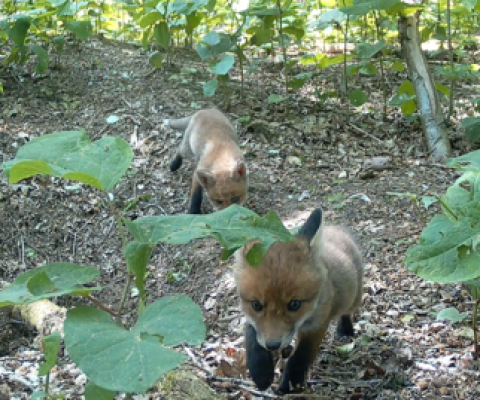 Op ons terrein hangt een wildcamera! Regelmatig zien we een aantal van onze bewoners voorbij komen. Boommarters, eekhoorns, reeën en zoals hier: twee jonge vosjes.